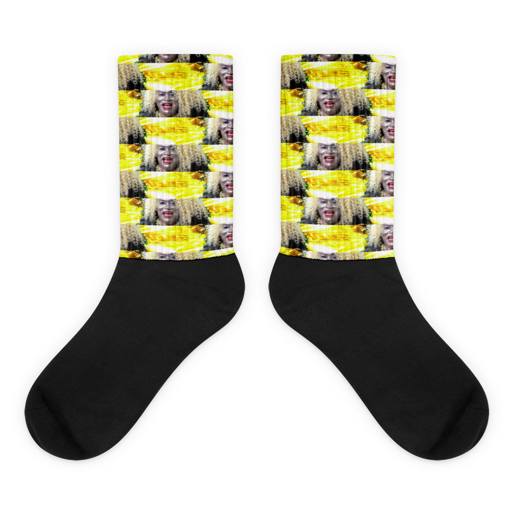 These socks are extra comfortable thanks to their cushioned bottom. The foot is black with artwork printed along the leg with crisp, bold colors that won’t fade.